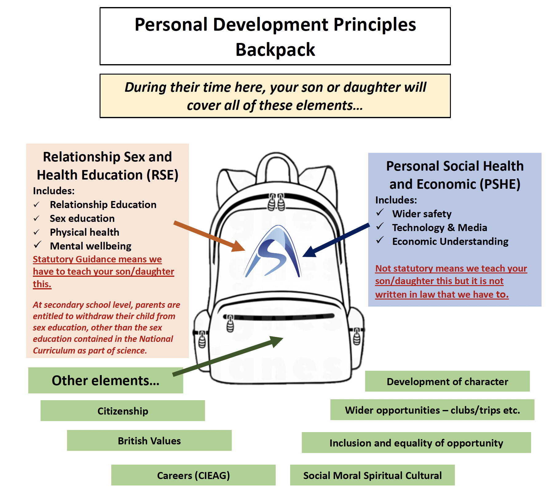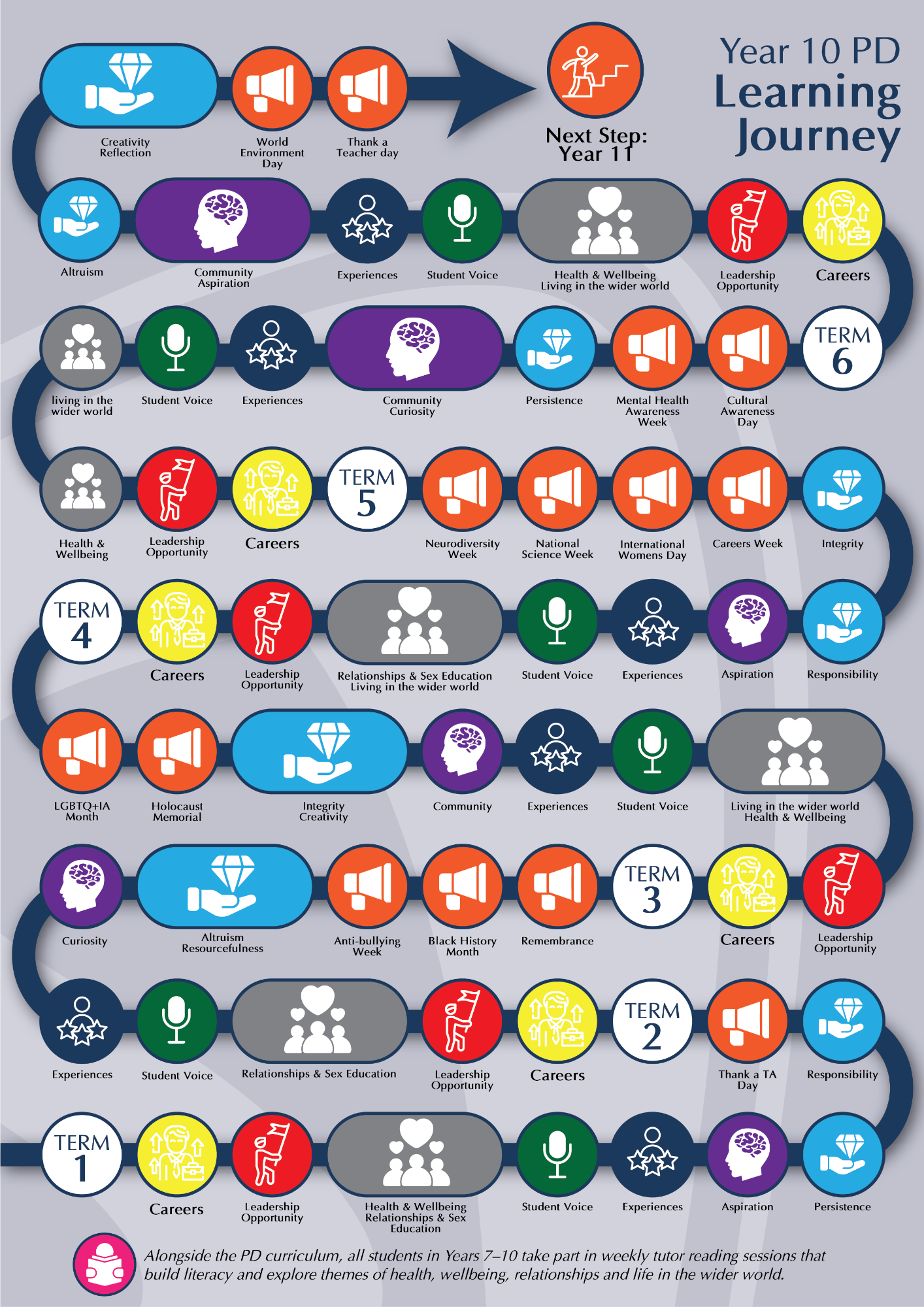All students take part in PSHE, covering Health and Wellbeing, Relationships and Living in the Wider World, alongside Relationships and Sex Education (RSE), Equality, Diversity and Inclusion, British Values, the Convention on the Rights of the Child and Careers Education.