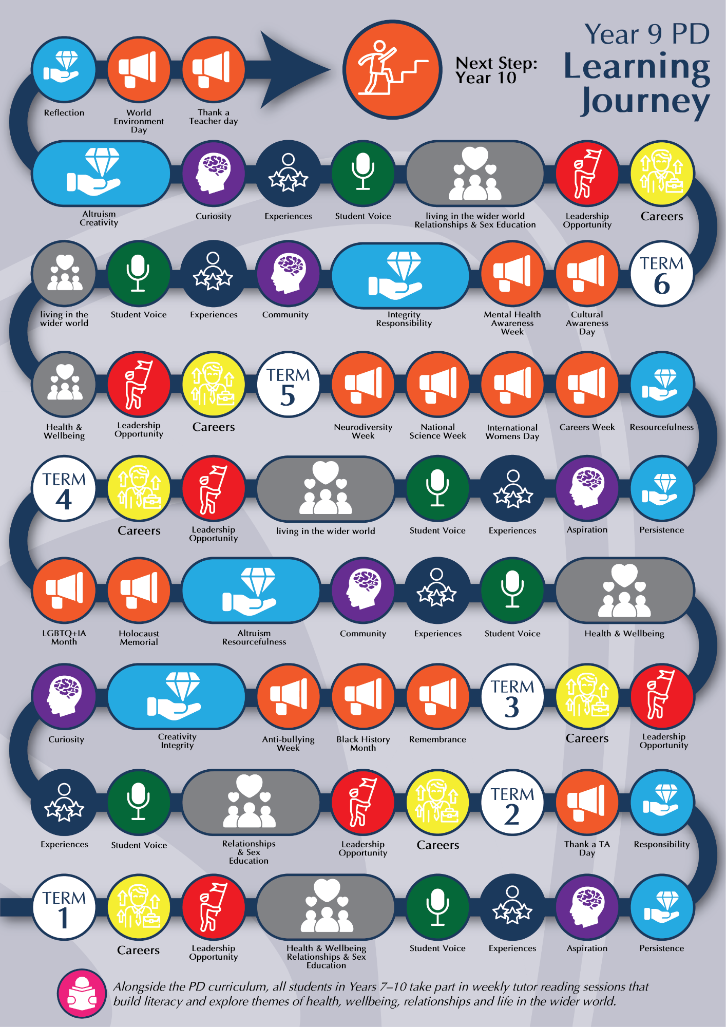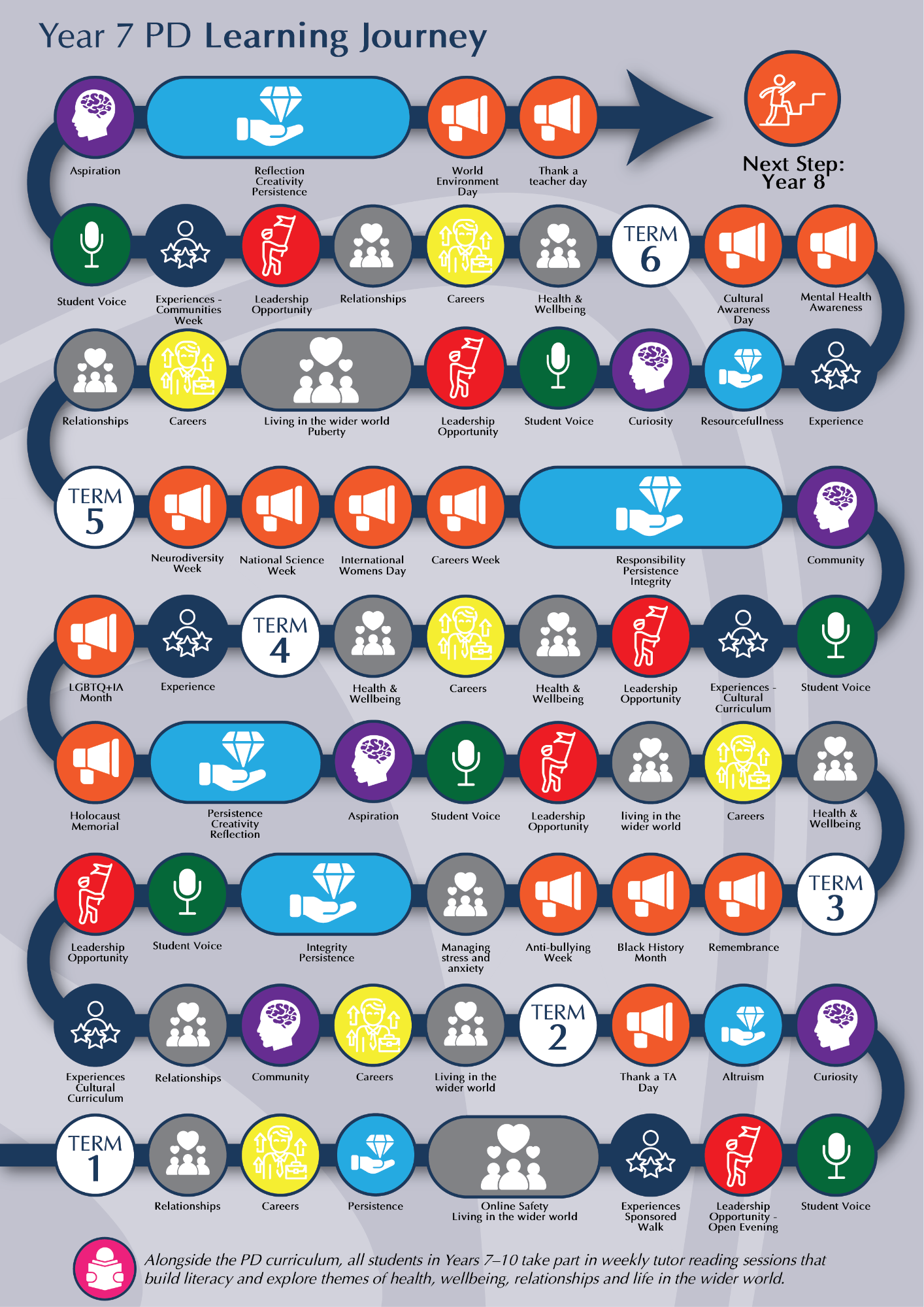 In addition to the PD curriculum, all students in Years 7–10 take part in a weekly tutor reading session dedicated to literacy and personal development.