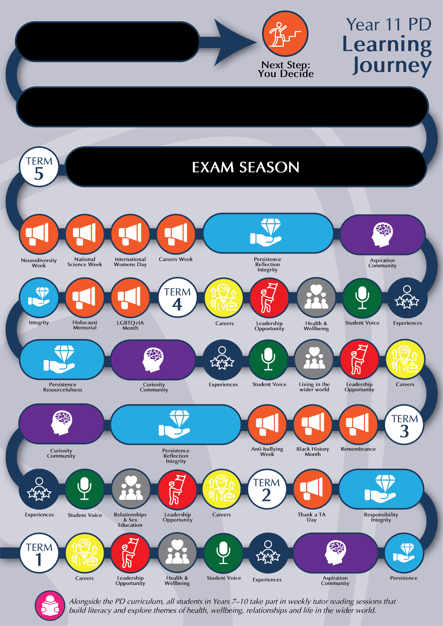Students in Years 9–11 continue Religious Education, while those in Years 12–13 extend their PD journey through sixth form Core sessions focused on life skills, post-18 pathways, employability and personal wellbeing.